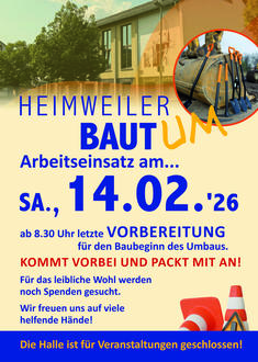 Ein weiterer Arbeitseinsatz vor Baubeginn im Innenbereich unter dem Motto: „Heimweiler baut um”, sucht nochmal tatkräftige Helferinnen und Helfer. Es sind noch vorbereitende Arbeiten vor dem offiziellen Start des Innenausbaus zu erledigen.