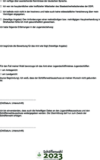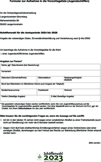 Personen, die zur Wahl als Jugendschöffin /Jugendschöffe vorgeschlagen werden, dürfen nicht noch einmal in die Vorschlagsliste einer Ortsgemeinde bzw. der Stadt Stromberg zur Wahl der Schöffinnen/Schöffen aufgenommen werden.