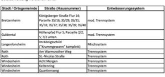 | Stadt / Ortsgemeinde | Straße (Hausnummer) | Entwässerungssystem |