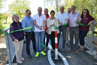 Beim feierlichen „Scherenschnitt“ VG-Beigeordnete Elke Stern, Ortsbürgermeisterin Peter Schermuly, Bürgermeister Michael Cyfka, Beigeordneter Dr. Jochen Coutandin, Staatssekretärin Petra Dick-Walter, Ortsbürgermeister Bernhard Wolf, technischer Projektleiter VG-Mitarbeiter Andreas Ruhl, Ortsbürgermeister Olaf Budde, VG-Mitarbeiterin Kirsten Mang zuständig für regionale Radwegekonzeption.