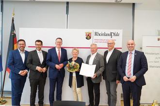 (v.l.n.r.): Philipp Fernis (MdL), 1. Kreisbeigeordneter Oliver Kohl, Innenminister Michael Ebling, Hannelore und Konrad Closheim, Ortsbürgermeister Prof. Bernhard Wolf und Bürgermeister Michael Cyfka.