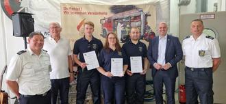 Die Vorbereitungen für das traditionelle Fest der Langenlonsheimer Feuerwehr hatten sich gelohnt, konnte man sich doch wieder über einen enormen Zuspruch bei der Bevölkerung und befreundeten Feuerwehren aus Nah und Fern freuen. Am Festsonntag nutze Bürgermeister Michael Cyfka die Gelegenheit, verdiente Feuerwehrkameradinnen und -kameraden zu befördern und somit seine Anerkennung für deren ehrenamtliches Engagement auszusprechen. Aufgrund erfolgreich absolvierter Fachausbildung wurden Sandra Haas zur Feuerwehrfrau und Niclas Jodeleit zum Oberfeuerwehrmann ernannt. Eric-Leon Mahlich konnte seine Beförderungsurkunde zum Hauptfeuerwehrmann aus den Händen des Bürgermeisters entgegen nehmen. Cyfka lobte den hervorragenden Zusammenhalt und die Bereitschaft der Floriansjünger, sich ständig fortzubilden und somit für die immer umfangreicher werdenden Aufgaben gut vorbereitet zu sein. Langenlonsheims Ortsbürgermeister Bernhard Wolf schloss sich den Glückwünschen des VG-Bürgermeisters und der VG-Wehrleitung an. Die vorgenommenen Ehrungen bildeten den Auftakt für einen abwechslungsreichen Festtag bei der Langenlonsheimer Freiwilligen Feuerwehr.