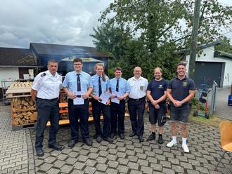 Gleich doppelten Grund zur Freude hatte kürzlich die Freiwillige Feuerwehr Dörrebach. Im Rahmen der Feierlichkeiten zum diesjährigen Sommerfest wurde Noah Eckes offiziell in die Einsatzabteilung der Dörrebacher Wehr aufgenommen und erhielt seine Verpflichtungsurkunde. Darüber hinaus konnte Wehrleiter Bernhard Schön gegenüber den Feuerwehrmann-Anwärtern Sebastian Jungbluth und Tobias Jungbluth die Beförderung zum Feuerwehrmann aussprechen. Zu den ersten Gratulanten zählten der stellvertretende Wehrleiter Peter Beurschgens und Wehrführer Jonas Graßmann. Auch die gesamte Mannschaft der Feuerwehr Dörrebach hieß die Verstärkung in ihren Reihen herzlich willkommen und freute sich über die Beförderungen ihrer beiden Kameraden zum Feuerwehrmann.
