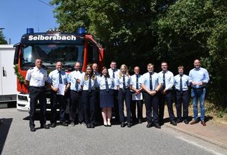 Für die Kameradinnen und Kameraden der Freiwilligen Feuerwehr Seibersbach gab es zum traditionellen Feuerwehrfest gleich mehrere Gründe zum Feiern. So konnte Bürgermeister Michael Cyfka das neue Mittlere Löschfahrzeug (MLF) offiziell an die Einheit übergeben und in Dienst stellen. Wehrführer Ralf Gorden Noch und seiner Mannschaft steht nun ein schlagkräftiges Einsatzfahrzeug mit einem Löschwassertank und umfangreicher Ausrüstung für die Menschenrettung, Brandbekämpfung und zur Technischen Hilfe zur Verfügung. Danach rückten die Mitglieder der Einsatzabteilung in den Mittelpunkt. Per Handschlag zum Feuerwehrdienst verpflichtet wurden Marisa Göretz und Rhona Stephan. Steffen Kemp wurde zum Feuerwehrmann ernannt und ihre Beförderungsurkunden zum Oberfeuerwehrmann bzw. Oberfeuerwehrfrau erhielten Magnus Nitze und Giovanna Tonn. Zum Hauptfeuerwehrmann wurde Niclas Baumgarten befördert. Mit der Verleihung der Fluthilfe-Medaille Rheinland-Pfalz bedankte sich Bürgermeister Cyfka im Namen der Ministerpräsidentin bei Steven Marnet, Steffen Kemp, Felix Sedlmeier, Stefan Tybussek und Ralf Gorden Noch für ihren außerordentlichen Einsatz bei der Hochwasserkatastrophe 2021. Mit den Glückwünschen verband der Bürgermeister den Wunsch, dass alle Einsatzkräfte immer gesund von den Einsätzen zu ihren Familien zurückkehren.