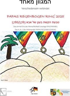 Der vierte Kalender zur Geschichte von „Papas Regenbogen Ring“ begeistert: Kinder der 4. Klassen in unserer Verbandsgemeinde waren wieder mit großer Freude dabei, im Rahmen der Kooperation von der Verbandsgemeinde Langenlonsheim-Stromberg und der Eckenroth Stiftung, mit ihren Werken einen Jahreskalender zu gestalten. Szenen zu der Geschichte von Papa Abi Avram und seinen drei Söhnen, Salama, Ibrahim und David, malten, zeichneten und collagierten die Kinder mit Einsatzfreude und Ausdauer. Eckenroth Autoren adaptierten die Ringparabel aus dem Stück „Nathan der Weise“ von Lessing für Kinder. In der Pandemie setzten die Verbandsgemeinde und die Eckenroth-Stiftung Zeichen, nach dem Motto „Wenn Grenzen schließen, öffnen wir Horizonte.“ Politik und Kunst wirken gemeinsam zum Wohl unserer Kinder und schreiben den Malwettbewerb für unsere Grundschulen seitdem jährlich aus. Gemeinsamer Wunsch ist es, Kindern altersgerecht die Chance zu bieten, in einem Klima der Verständigung und des Verstehens aufzuwachsen und gegenwärtig