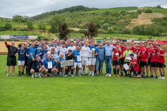 Sieger des VG-Pokals 2023, SG Soonwald (links), Ortsbürgermeister Dörrebach und VG-Beauftragter Fußball Harald Scholl, Bürgermeister Michael Cyfka und TSV Langenlonsheim-Laubenheim II (rechts).