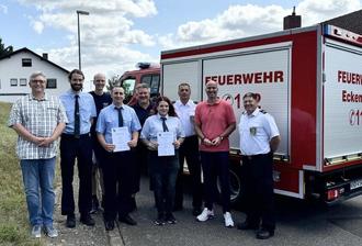 Der Einladung der Freiwilligen Feuerwehr Eckenroth zum Sommerfest 2024 waren zahlreiche Feuerwehren und Bürgerinnen und Bürger aus nah und fern gerne gefolgt. Bürgermeister Michael Cyfka freute sich, am Festsonntag mit Alexander Kosi eine neue Einsatzkraft per Handschlag und Überreichung der Verpflichtungsurkunde offiziell in den Dienst der Eckenrother Feuerwehr aufnehmen zu können. Darüber hinaus beförderte er aufgrund erfolgreich abgeschlossener Weiterbildungen Giuliana Dietzen zur Oberfeuerwehrfrau und Daniel Dietzen zum Oberfeuerwehrmann. Neben Bürgermeister Cyfka gratulierten auch die Wehrleitung der Verbandsgemeinde, Wehrführer Daniel Adam und der neue Ortsbürgermeister Michael Sieper zum frisch erworbenen Dienstgrad und zur Aufnahme in den aktiven Feuerwehrdienst. Abschließend gilt der Dank auch allen Kameradinnen und Kameraden, die mit der Fluthilfe-Medaille des Landes Rheinland-Pfalz ausgezeichnet wurden.