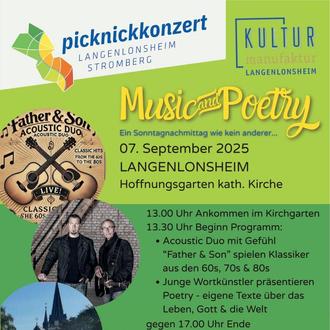 Die erfolgreiche Open-Air-Reihe „Picknickkonzerte“ wird am Sonntag, 7. September 2025, in Langenlonsheim fortgeführt. Von 13 bis 17 Uhr lädt die Kulturmanufaktur Langenlonsheim in den idyllischen Kirchgarten der katholischen Kirche ein – zu einem ganz besonderen Nachmittag unter dem Motto „Picknick, Poetry & gute Vibes“.