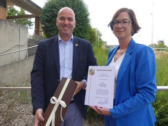 Im Rahmen der Sitzung des Verbandsgemeinderates überreichte Bürgermeister Cyfka eine Dankurkunde der Verbandsgemeinde und ein Weinpräsent an Maren Bott.