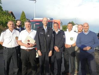 v.l.: BKI W. Hofmann, Ortsbürgermeister C. Braun, F. Röser, Wehrführer D. Adam, VG-Bürgermeister M. Cyfka, Wehrleiter B. Schön