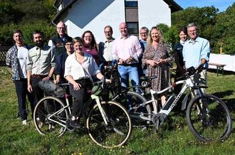 Auf dem Foto von links nach rechts: Michael Koch (Geschäftsführer Saarental), Nationalparkranger, Martin Grünbaum ("Tourismusförster"), Katja Hilt, Katharina Martini, Kirsten Mang (Leiterin Stabsstelle Tourismus VG), Michael Franzmann (Büroleitung Landesforsten), Bürgermeister Michael Cyfka, Harald Scholl (Ortsbürgermeister Dörrebach), Landrätin Bettina Dickes, Vertreterin für Naturpark Soonwald-Nahe, Frank Ridderbusch (Leitender Forstdirektor Landesforsten)