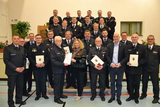 So konnten Bürgermeister Cyfka, Wehrleiter Bernhard Schön, die stellvertretenden Wehrleiter Peter Beurschgens und Wolfgang Closheim im Beisein von Brand- und Katastrophenschutzinspekteur Werner Hofmann gemeinsam zahlreiche Neuverpflichtungen vornehmen, Beförderungen aussprechen und verdiente Feuerwehrkameradinnen und -kameraden für ihre langjährige und treue Pflichterfüllung und ihre besonderen Verdienste um das Feuerwehrwesen mit dem Feuerwehr-Ehrenzeichen auszeichnen. Durch das Erreichen der Altersgrenze wurden auch zwei Kameraden aus dem aktiven Dienst verabschiedet.