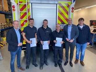Im Rahmen eines Dienstgespräches konnten der Bürgermeister der Verbandsgemeinde Rüdesheim, Markus Lüttger, und sein Amtskollege aus der Verbandsgemeinde Langenlonsheim-Stromberg, Bürgermeister Michael Cyfa, drei Kameraden des Dienstleistungszentrums Feuerwehr und Katastrophenschutz (DLZ) in Rüdesheim mit der Fluthilfe-Medaille des Landes Rheinland-Pfalz auszeichnen.