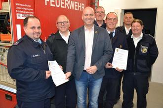 Ortsbürgermeister Olaf Budde überbrachte den neuen Amtsinhabern Marcus Kunz und Bernd Wagner die Glückwünsche der Ortsgemeinde und sprach Martin Wagner Dank und Anerkennung aus für die erfolgreiche Führung der Ortswehr Bretzenheim über den Zeitraum einer ganzen Generation.