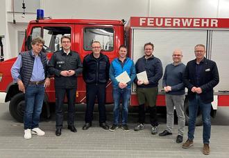 V.l.n.r.: Ortsbürgermeister Reinhold Bott, Wehrleiter Christian Vollmer, Wehrführer Joachim Petry, Stellv. Wehrführer Martin Schneider, Alexander Griesbach, Ortsbürgermeister Haiko Grün und Bürgermeister Markus Lüttger
