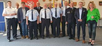 (v.l.n.r.): WL Christian Vollmer, BKI Werner Hofmann, Beigeordneter Heinz-Martin Schwerbel, Jürgen Lindner, Stephan Wagner, Uwe Bäder, Bernd Gallon, Michael Roth, Hermann-Josef-Lukas, Lothar Franzmann, Rolf Merg, Bürgermeister Markus Lüttger, Landrätin Bettina Dickes
