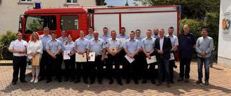 Nach einem kurzen Grußwort des Fördervereinsvorsitzenden Wilfried Diepers begrüßte und verpflichte Bürgermeister Markus Lüttger mit Emilia Dijkland, Christian Karsch, Máté Libor und David Senger vier weitere Aktive in der Feuerwehreinheit Norheim. Zum Feuerwehrmann wurde Pascal Brendel und zum Oberfeuerwehrmann Leon Hennen befördert. Fabian Butz, Vincent Hesselbach, Samuel Landgrebe und Heiko Simon führen nach erfolgreich absolvierten Ausbildungen künftig den Dienstgrad des Hauptfeuerwehrmanns und Dominik Krieger wurde zum Brandmeister befördert.