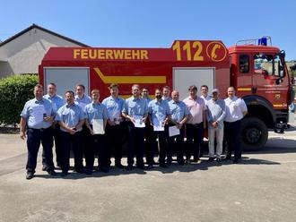 Die beförderten und geehrten Aktiven v.l.n.r.: Alexander Fink, Stellvertretender Wehrführer Mario Becker, Stefan Röder, Jonas Templin, Florian Kühn, Ronnie Mahle, Wehrführer Michael Lipps, Matthias Schneider, Christian Mecking, MdL Markus Stein, Thomas Haas, Erster Beigeordneter Heinz-Martin Schwerbel, Wehrleiter Christian Vollmer, Ortsbürgermeister Jürgen Klotz und Stellvertretender Brand- und Katastrophenschutzinspekteur Holger Schmidt