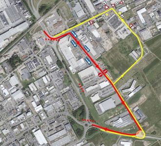 Verkehrsteilnehmer mit dem Ziel REWE-Markt oder Diskothek-VIVA können von beiden Seiten das Gewerbegebiet anfahren. Die Ausfahrt zurück ist wegen der Einbahnregelung jedoch nur rechts-läufig Richtung Decathlon / Gartencenter möglich.