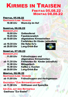 Bereits am Freitagabend lädt das Gasthaus Linn / Schuck zum Warm-Up im Hof ab 19.00 Uhr, bevor dann am Samstag, 5. August, um 18.00 Uhr die Kerb mit einem Gottesdienst im Festzelt offiziell eröffnet wird. Ab 18.45 Uhr folgt dann der Fassbieranstich, ab 19.00 geht es dann endlich los mit dem „Kirmestreiben“!