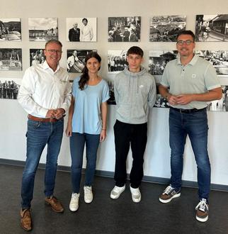 Bürgermeister Markus Lüttger und Büroleiter Christian Vollmer begrüßen die neuen Auszubildenden Celine Heckmann und Thomas Röth.