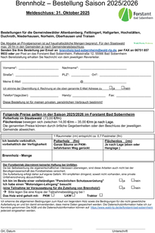 Melden Sie Ihren Brennholzbedarf bitte unbedingt bis zum 31. Oktober 2025; spätere Anfragen können aus organisatorischen Gründen in der Regel nicht mehr angenommen werden.