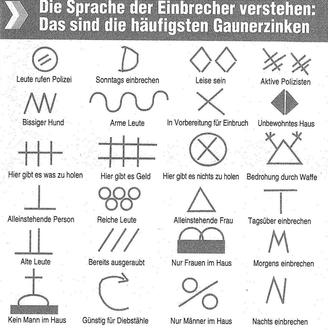 Unser Tipp: Wenn Sie eines oder ein ähnliches dieser Symbole sehen, dann merken Sie sich die Bedeutung für Ihr Daheim und informieren Sie auch Ihre Nachbarn. Danach sollten Sie dieses Gekritzel abputzen, übermalen oder überkleben. Ratsam ist auch eine zügige Information Ihrer nächstgelegenen Polizeidienststelle.