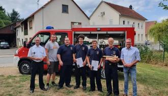 v.l.n.r.: Stellvertretender Wehrleiter Rouven Ginz, Ortsbürgermeister Florian Keller, Wehrführer Sascha Euler, Ben-Luca Franzmann, Paul Franzmann, Wilfried Kaul, Bürgermeister Markus Lüttger