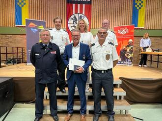 Im Namen des Deutschen Feuerwehrverbandes zeichneten Norbert Jung und Brand- und Katastrophenschutzinspekteur Werner Hofmann Bürgermeister Markus Lüttger mit der Deutschen Feuerwehr-Ehrenmedaille aus und dankten ihm für sein Engagement.