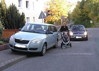 Diese sollten nicht auch noch von Autos „in Beschlag“ genommen werden - zumal dies auch nach der StVO nicht zulässig ist. Was für Autofahrer oftmals nur ein Stück Bequemlichkeit ist, kann für junge und alte Passanten eine überaus gefährliche „Ausweichstrecke“ (s. Bild) bedeuten. Denn was z. B. viele nicht wissen: Kinder bis 8 Jahre müssen mit dem Fahrrad auf dem Gehweg fahren.