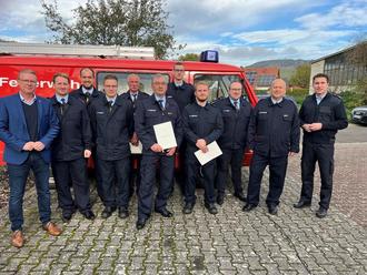 Zum offiziellen Teil konnte Bürgermeister Markus Lüttger im Beisein von Wehrleiter Christian Vollmer und Ortsbürgermeister Sascha Wickert eine Verpflichtung, Beförderungen und Ehrungen vornehmen. So wurde Björn Effgen als neues Mitglied verpflichtet und gleichzeitig zum Oberfeuerwehrmann befördert. Nach erfolgreich absolvierter Grundausbildung erhielten auch Noah Franzmann, Maximilian Herter, Philipp Hoseus und Maximilian Saueressig die Beförderungsurkunden zu Oberfeuerwehrmännern.