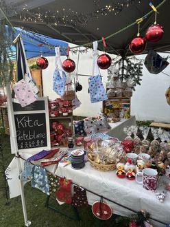 Wie im vergangenen Jahr gab es von der Kita Pusteblume Neesbach einen Stand, an dem die Kolleg*innen, die in der Kita selbst hergestellten Sachen, wie: Glühweinaufstrich, Kürbis,- und Apfelaufstrich, sowie Kräutersalze, Schokocrossies, „Handtaschengedöns-Schachteln“ für die Handtasche, Leder Elefantenanhänger, selbst gestaltete Christbaumkugeln …uvm., auf Spendenbasis angeboten haben.