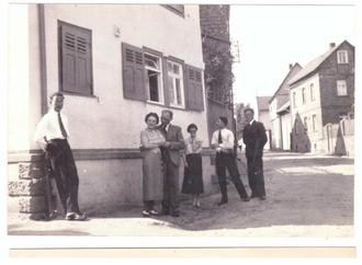 Familie Besmann und Stern Anfang der 1930er Jahre vor dem Haus in der Sonntagsstraße, 1. v.l. Abo Besmann, 2. v.l. Hanni Besmann, 1. v.r. Siggi Besmann, 2. v.r. Walter Stern, Quelle: Fam. Stern