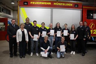 Aufgrund der absolvierten Lehrgänge und erforderlichen Dienstzeiten wurden einige Mitglieder der Einsatzabteilung zum Abschluss der Versammlung befördert: Johanna Walter und Lara-Celine Lang wurden zur Feuerwehrfrauanwärterin ernannt, Selina Hannappel, Kerstin Dehnert, Julia Schneider und Silke Schmidt zur Feuerwehrfrau. Sophia Marie-Lang, André Großmann und Constantin Grün sind nun Hauptfeuerwehrfrau bzw. Hauptfeuerwehrmann, Christian Becker darf sich nun Oberlöschmeister nennen.