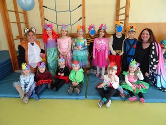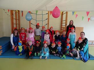 HELAU! schallte es aus allen Räumen der Kita Kirberg. Bereits am Donnerstag von Altweiberfasching ging es los und die Kinder kamen bunt verkleidet in die Kita. Unsere „Riesen“, die Vorschulkinder, waren von den weißen Funkern eingeladen worden, die Rathausstürmung zu unterstützen und bereicherten dort das Programm mit dem Tanz zu „Der Zug hat keine Bremsen“. Natürlich konnten sie den Saal ohne eine Zugabe nicht verlassen und zeigten noch die „Partyexplosion“. In der Kita wurde dann gemeinsam mit allen Kindern zu Faschingsmusik getanzt und der Turnraum für unsere große Fassenachtsparty am Folgetag aufwendig geschmückt. Die Kinder waren sehr aufgeregt, denn sie hatten seit Wochen ein buntes Programm eingeübt, was an der Party allen Kindern und Erzieherinnen vorgeführt werden sollte. Die Eltern hatten mit einem tollen und umfangreichen Buffet zum Gelingen der Feier beigetragen. So konnte nach Herzenslust getobt, getanzt und geschmaust werden. Als alle gestärkt waren ging es auch schon los: Auf einem eigens gebauten Laufsteg fand eine große Modenschau statt, auf der alle Kinder ihr Kostüm präsentieren durften. Jede Gruppe der Kita hatte einen eigenen Tanz eingeübt und dazu im Vorfeld tolle Accessoires gebastelt. Die Igel zeigten „Wenn der Elefant in die Disko geht“ und hatten dazu verschiedene Tiermasken gestaltet.