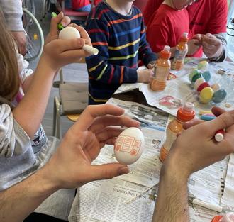 In der Cafeteria ging es dann zur Sache, denn hier war alles liebevoll vorbereitet für die große Ostereierfärberei. Jung und Alt färbten und bemalten gemeinsam viele gekochte sowie ausgeblasene Eier. Dabei wurde sich lebhaft unterhalten. Nach dem die ausgeblasenen Eier schön bunt waren, wurden diese von den Löschzwergen an Ästen aufgehangen. Somit entstand ein wunderschöner Osterstrauch für den Wohnbereich.