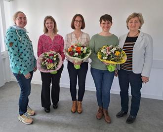 Frau Jennifer Weiler (2. von links), Frau Nadja Kübeler (mittig), Frau Melanie Staat (2. von rechts) gemeinsam mit der Personalratsvorsitzenden Bonny Bohn (links) und der Bürgermeisterin Silvia Scheu-Menzer (rechts).