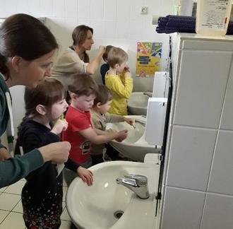 So haben die Kinder der Kita Heringen auch dieses Jahr wieder mit der Zahnputzhexe Irma spielerisch die Kai-Zahnputztechnik geübt.