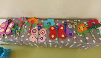 Die Vorbereitungen dafür begannen bereits Ende März. Alle Kinder haben fleißig Kochlöffel angemalt. Die Kinder durften sich aussuchen ob sie einen Schmetterling, einen Frosch oder eine Blume daraus mit den Großeltern basteln wollen.