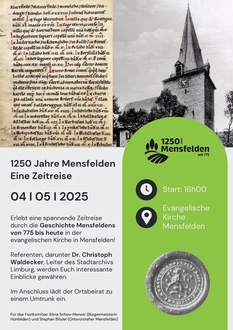 Im Jahr 2025 blickt Mensfelden auf eine beeindruckende 1.250 Jahre alte Geschichte zurück. Zu diesem besonderen Ereignis lädt das Festkomitee am Sonntag, den 04.05.2025, um 16 Uhr zu einer spannenden Zeitreise in die evangelische Kirche in Mensfelden ein.