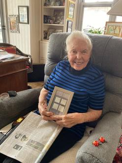 Zeitzeugin Lore Moser Brenauer mit einem Bild der verlegten Stolpersteine und dem Hünfeldener Mitteilungsblatt in New York am 6. April 2025