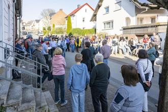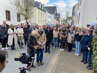 Lynette Polatin (vorne links), Nachfahrin der Dauborner Familie Buchheim, bei der Stolpersteinverlegung am 01. April