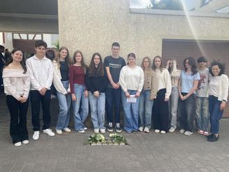 Lehrerin Patricia Birkenfeld (1. v.r.) mit Schülerinnen und Schülern der Freiherr-vom-Stein Schule bei der Stolpersteinverlegung in Kirberg am 27. Mai