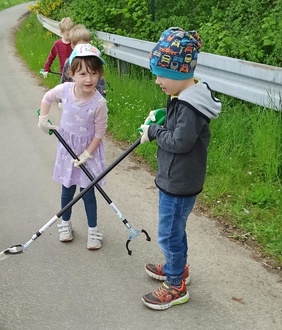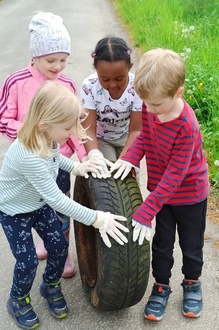 Neben Glas, Plastik und Papier, haben wir dieses Jahr sogar einen alten Autoreifen gefunden. Mit vollem Stolz wurde der Reifen sicher in den Kindergarten gerollt. Die Frage der Kinder: „Wie ist das Auto mit drei Reifen nach Hause gekommen?“