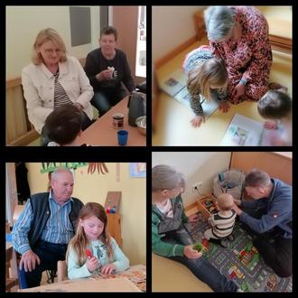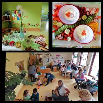 Während dem Freispielangebot hatten alle die Gelegenheit, selbst Materialien beim Bauen, Puzzeln, Malen, Portfolio-Order durchstöbern auszuprobieren, oder sich durch Tischspiele wie Memory, Mensch-ärgere-dich-nicht, an eigene Kindheitstage zu erinnern. Währenddem offenen „Mittagssnack“ durfte an dem bunten Buffet von mitgebrachtem Obst- Fingerfood- und Keksspenden im Bistrobereich genascht werden. Für Getränke wurde auch gesorgt. Nach der Freispielzeit trafen sich alle wieder im großen Kreis zum gemeinsamen Abschluss. Um die Stuhlkreis-Spiele transparent zu machen, präsentierten die Kinder die Spiele von den „Zappelmännern“, „5 kleine Äffchen“, das „Pinguinspiellied“ und den „Entchenrock“, was die Großeltern zum Mitmachen eingeladen hatte. So klang der Nachmittag für alle mit schönen Erlebnissen, Gesprächen und Eindrücken aus.