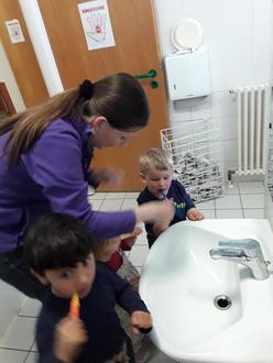 Die Kinder begrüßten sie mit dem Zahnputzlied „Zähne putzen ist gesund“ und zeigten ihr anschließend ganz genau, wie man richtig die Zähne putzt. Zum Schluss wurde natürlich auch selbst gründlich geputzt – als kleine Belohnung gab es für jedes Kind eine Urkunde und einen Aufkleber von Irma.