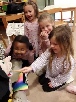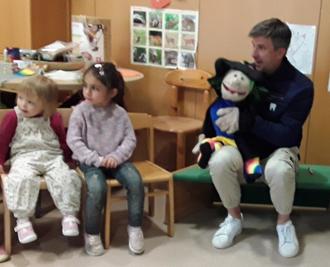 Zwei Wochen später kam Herr Dr. Litzinger noch einmal zu Besuch – diesmal direkt in den Kindergarten nach Heringen. Mit dabei war auch Irma, die lustige Zahnputz-Hexe.