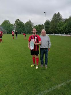 Auf dem Foto zu sehen der Spielführer der SG Heringen/Mensfelden Hendrik Schäfer der anlässlich seines Tores,das war der 100 Treffer der SG Heringen/Mensfelden beim Gastspiel in Winkels,ein kleines Präsent von Sport 11 erhielt.