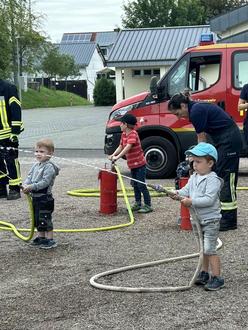 Danach wurden die Türen für alle Kindergartenkinder geöffnet. Alle Kinder schauten sich das Feuerwehrhaus an, bestaunten die Feuerwehr- Schutzausrüstung, kletterten ins Feuerwehrauto, freuten sich über das Blaulicht und übten sich im Feuerlöschen.
