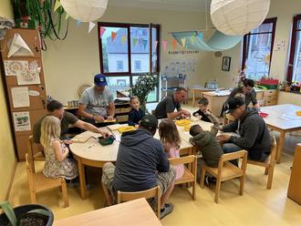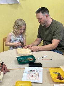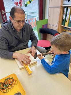 Bereits zum 3. Mal fand das Angebot „Vater-Kind-Nachmittag“ in der Kita Pusteblume statt. Am Freitag, den 17.05.2024, wurden alle Teilnehmer herzlich in einem Gruppenraum begrüßt. Danach informierte Frau Heß über die heutige Gemeinschaftsarbeit zwischen den Papas und ihren Kindern. Ausgerüstet mit Hammer und Nägel, hatte jede „Familie“ ein Holzbrettchen erhalten, was als „Nagelbild“ gestaltet werden konnte. Dann ging es los… Erst wurden die Punktmarkierungen eingezeichnet, wo später ein Nagel seinen Platz bekommen sollte.